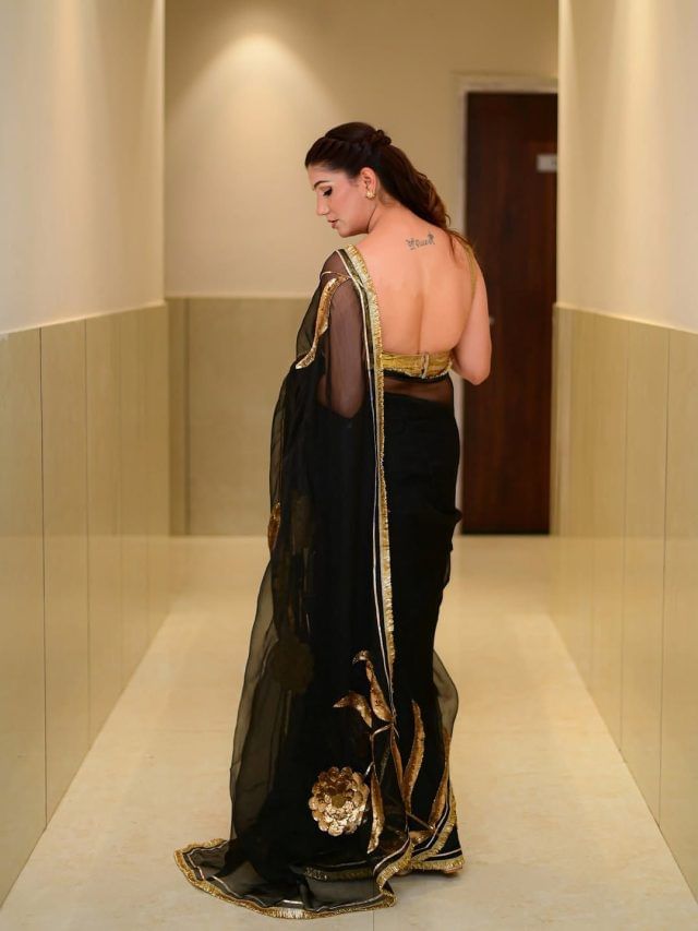 ਬਲੈਕ ਨੈੱਟ ਵਾਲੀ ਸਾੜੀ ਦੇ ਨਾਲ ਸਪਨਾ ਚੌਧਰੀ ਨੇ ਗੋਲਡਨ ਬਲਾਓਜ਼ ਪੇਅਰਅੱਪ ਕੀਤਾ ਹੈ। ਇਸ ਦੌਰਾਨ ਉਹ ਸਾੜੀ ਦਾ ਪੱਲੂ ਵੀ ਲਹਿਰਾਉਂਦੀ ਹੋਈ ਪੋਜ ਦੇ ਰਹੀ ਹੈ।