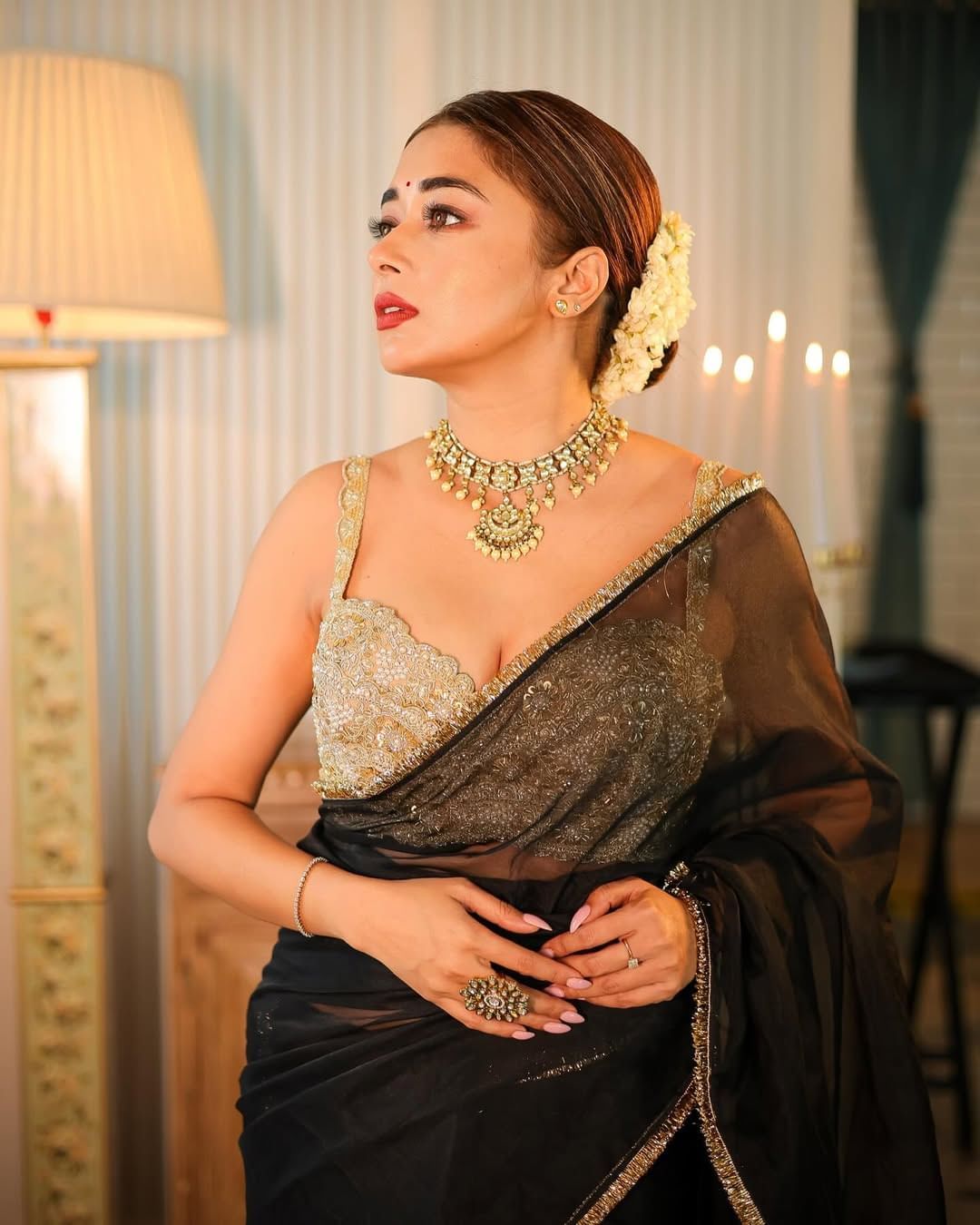 ਟੀਨਾ ਦੱਤਾ ਦਾ ਇਹ ਲੁੱਕ ਤਿਉਹਾਰਾਂ ਦੇ ਸੀਜ਼ਨ ਦੌਰਾਨ ਕਾਫੀ ਐਲੀਗੈਂਟ ਹੈ। ਅਦਾਕਾਰਾ ਨੇ ਭਾਰੀ ਸੁਨਹਿਰੀ ਬਾਰਡਰ ਵਾਲੀ ਗੁਲਾਬੀ ਸਿਲਕ ਸਾੜੀ ਪਹਿਨੀ ਹੈ । ਇਸਦੇ ਨਾਲ ਹੀ ਕਲਾਸਿਕ ਲੁੱਕ ਲਈ ਗਜਰਾ ਵੀ ਵਾਲਾਂ ਵਿੱਚ ਲਗਾਇਆ ਹੈ ।