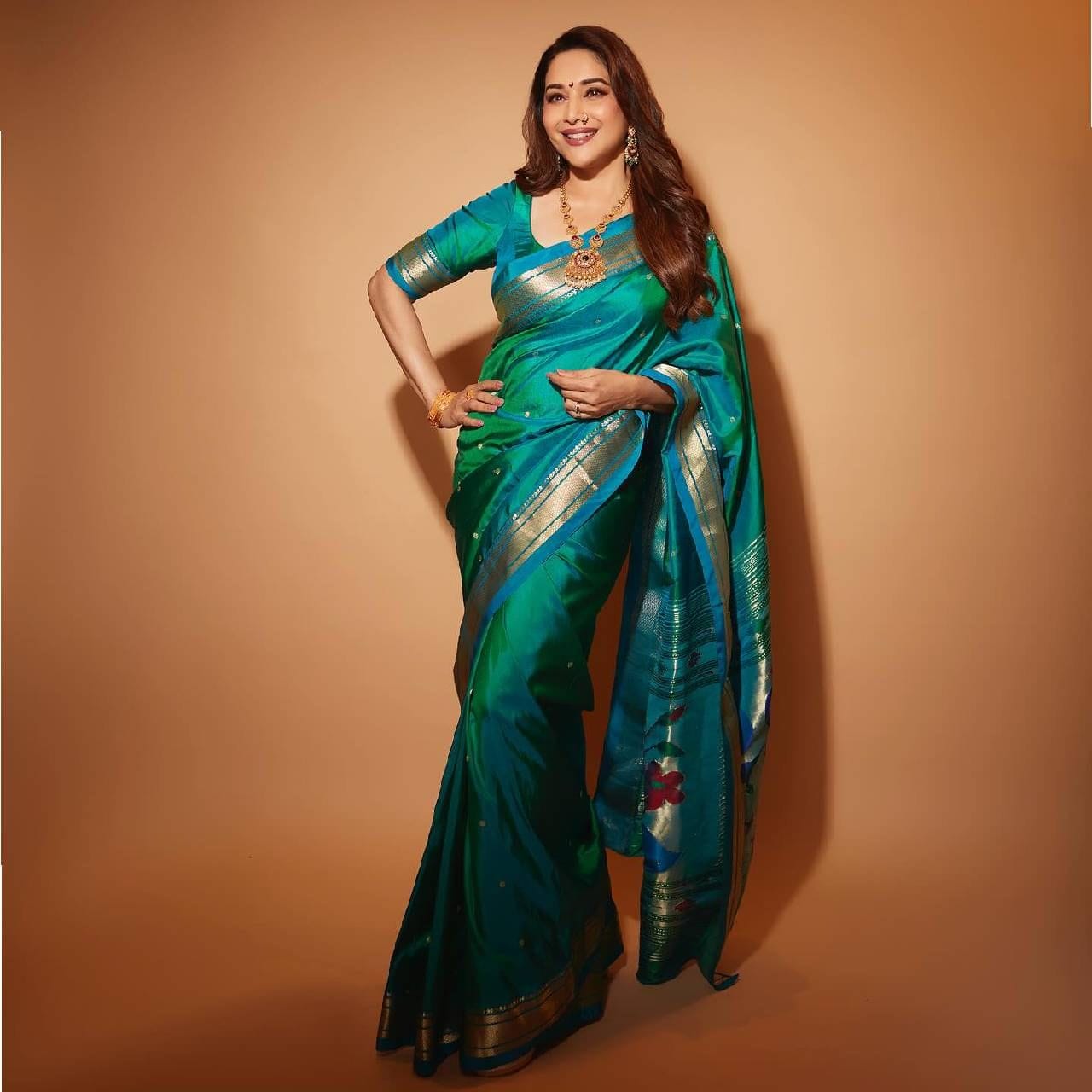 ਮਾਧੁਰੀ ਨੇ ਪ੍ਰਿੰਟਿਡ ਸਾੜੀ ਪਾਈ ਹੋਈ ਹੈ, ਸਾੜੀ ਦੇ ਕਿਨਾਰਿਆਂ 'ਤੇ ਕਢਾਈ ਦਾ ਕੰਮ ਹੈ। ਇਸ ਕਿਸਮ ਦੀ ਸਾੜੀ ਤਿਉਹਾਰ ਲਈ Perfect ਹੈ।