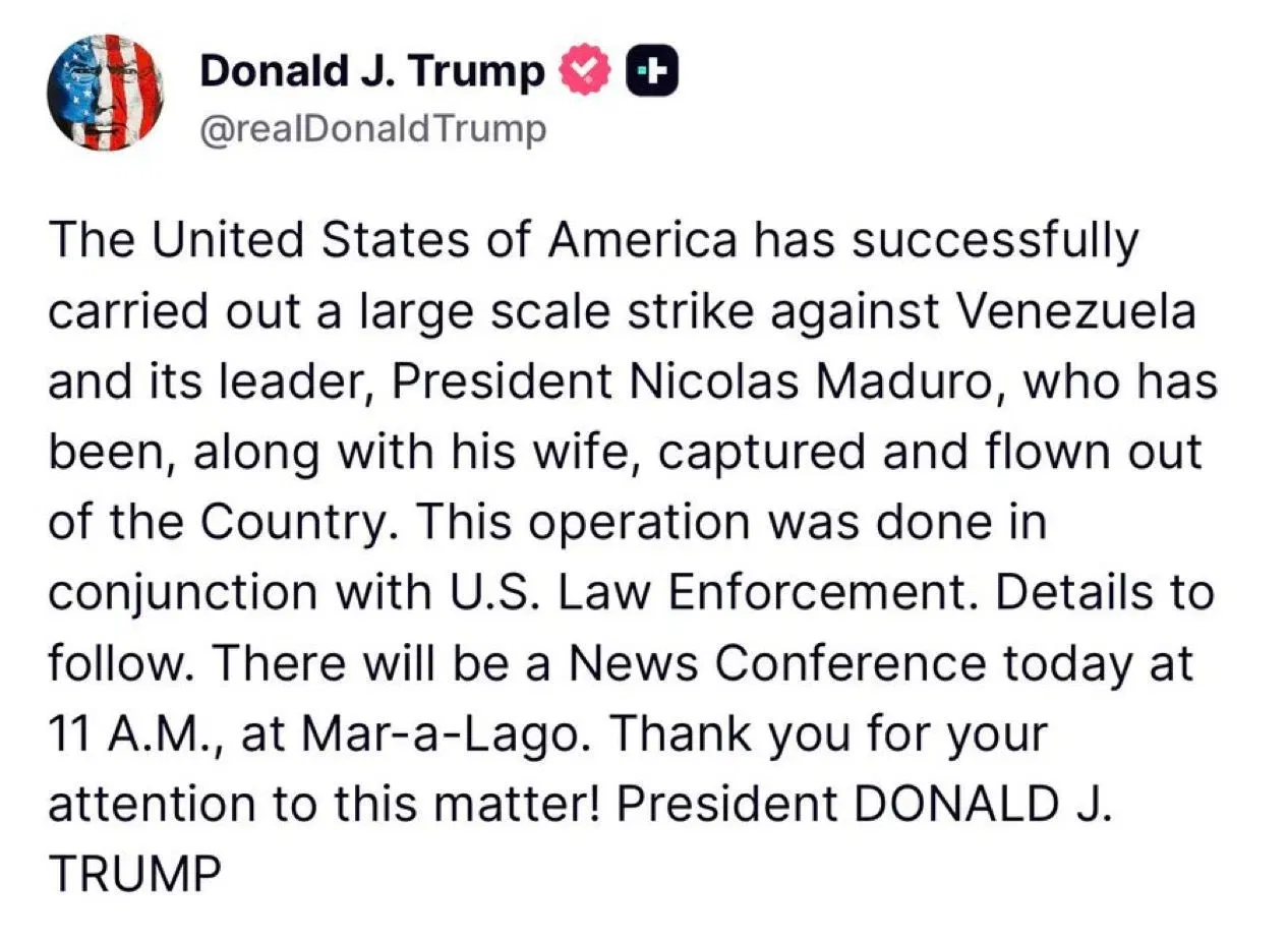 ਇੰਨਾ ਹੀ ਨਹੀਂ, ਟਰੰਪ ਨੇ ਇੱਕ ਹੈਰਾਨ ਕਰਨ ਵਾਲਾ ਦਾਅਵਾ ਵੀ ਕੀਤਾ। ਉਨ੍ਹਾਂ ਕਿਹਾ ਕਿ ਵੈਨੇਜ਼ੁਏਲਾ ਦੇ ਰਾਸ਼ਟਰਪਤੀ ਨਿਕੋਲਸ ਮਾਦੁਰੋ ਨੂੰ ਉਨ੍ਹਾਂ ਦੀ ਪਤਨੀ ਸਮੇਤ ਗ੍ਰਿਫ਼ਤਾਰ ਕਰਕੇ ਦੇਸ਼ ਤੋਂ ਬਾਹਰ ਲੈ ਜਾਇਆ ਗਿਆ। ਹੈ ਟਰੰਪ ਨੇ ਅੱਗੇ ਕਿਹਾ ਕਿ ਅੱਜ ਸਵੇਰੇ 11 ਵਜੇ ਮਾਰ-ਏ-ਲਾਗੋ ਵਿੱਚ ਇੱਕ ਪ੍ਰੈਸ ਕਾਨਫਰੰਸ ਕੀਤੀ ਜਾਵੇਗੀ, ਜਿੱਥੇ ਕਾਰਵਾਈ ਨਾਲ ਸਬੰਧਤ ਸਾਰੇ ਮਹੱਤਵਪੂਰਨ ਅਤੇ ਵਿਸਤ੍ਰਿਤ ਤੱਥ ਜਨਤਕ ਕੀਤੇ ਜਾਣਗੇ।