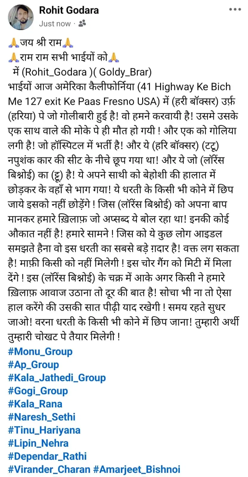 ਪੋਸਟ ਦੇ ਮੁਤਾਬਕ, ਹਮਲੇ ਵਿੱਚ ਹੈਰੀ ਬਾਕਸਰ ਨੂੰ ਨਿਸ਼ਾਨਾ ਬਣਾਇਆ ਗਿਆ ਸੀ। ਜਿਸ ਵਿੱਚ ਉ ਸਦਾ ਇੱਕ ਸਾਥੀ ਮੌਕੇ ‘ਤੇ ਹੀ ਮਾਰਿਆ ਗਿਆ ਸੀ, ਜਦੋਂ ਕਿ ਇੱਕ ਹੋਰ ਜ਼ਖਮੀ ਹੋ ਕੇ ਹਸਪਤਾਲ ਵਿੱਚ ਭਰਤੀ ਹੈ। ਗੋਦਾਰਾ ਨੇ ਦਾਅਵਾ ਕੀਤਾ ਕਿ ਹੈਰੀ ਬਾਕਸਰ ਕਾਰ ਦੀ ਸੀਟ ਦੇ ਹੇਠਾਂ ਲੁਕ ਗਿਆ ਅਤੇ ਆਪਣੇ ਜ਼ਖਮੀ ਸਾਥੀ ਨੂੰ ਪਿੱਛੇ ਛੱਡ ਕੇ ਭੱਜ ਗਿਆ। ਇਸ ਹਮਲੇ ਨੂੰ ਲਾਰੈਂਸ ਬਿਸ਼ਨੋਈ ਅਤੇ ਉਸ ਦੇ ਸਮਰਥਕਾਂ ਵਿਰੁੱਧ ਚੇਤਾਵਨੀ ਵਜੋਂ ਦਰਸਾਇਆ ਗਿਆ ਹੈ। ਰੋਹਿਤ ਗੋਦਾਰਾ ਨੇ ਪੋਸਟ ਵਿੱਚ ਲਿਖਿਆ ਕਿ ਜੋ ਵੀ ਇਸ ਗਿਰੋਹ ਵਿੱਚ ਸ਼ਾਮਲ ਹੁੰਦਾ ਹੈ ਉਸ ਨੂੰ ਨਤੀਜੇ ਭੁਗਤਣ ਲਈ ਤਿਆਰ ਰਹਿਣਾ ਚਾਹੀਦਾ ਹੈ।