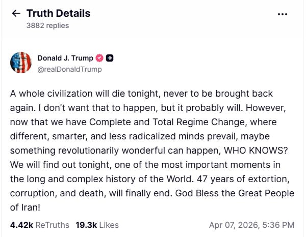 ਅੱਜ ਰਾਤ ਇੱਕ ਸੱਭਿਅਤਾ ਖਤਮ ਹੋ ਜਾਵੇਗੀ, 47 ਸਾਲਾਂ ਦੀ ਹਿੰਸਾ ਦਾ ਅੰਤ ਹੋਵੇਗਾ… ਟਰੰਪ ਦੀ ਈਰਾਨ ਨੂੰ ਧਮਕੀ, ਈਰਾਨ ਨੇ ਦਿੱਤ ਜਵਾਬਹ